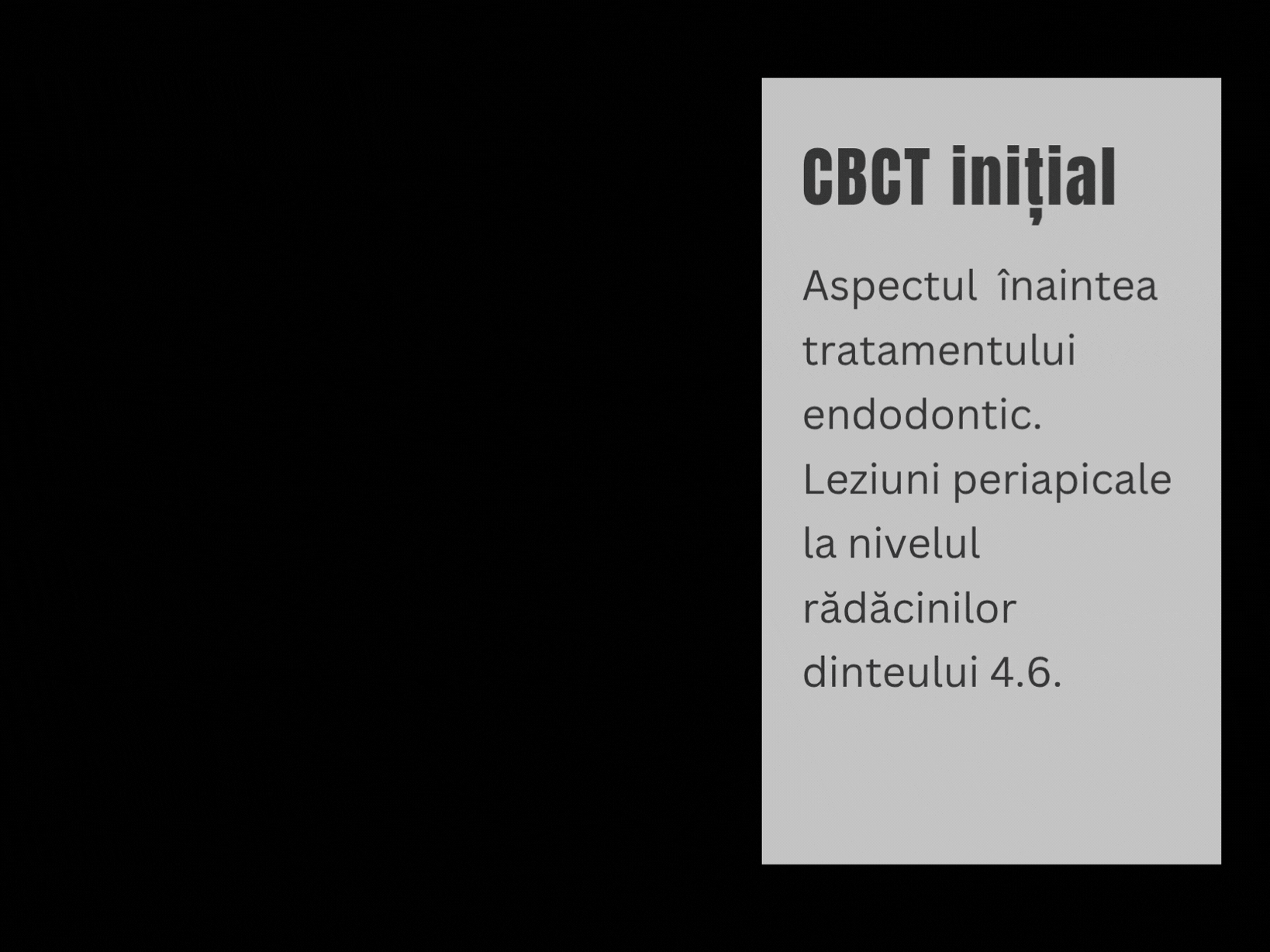 Pacienta, în vârstă de 67 de ani, s-a prezentat pentru evaluarea dintelui 4.6, pentru care tratamentul endodontic efectuat în antecedente nu a avut succes. În urma examinării imagistice și clinice multidisciplinare, dintele a fost considerat compromis din punct de vedere endodontic și parodontal, fiind indicat tratamentul radical.